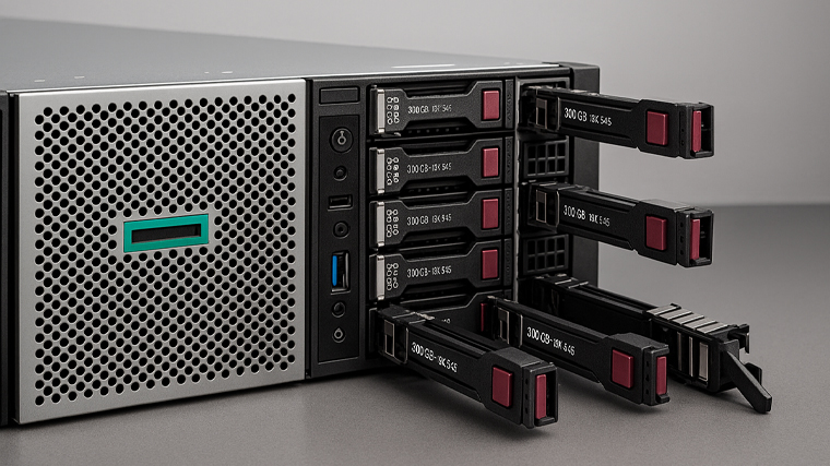 مدل‌هایی مانند DL380 Gen10 با ۱۲ یا ۲۴ خشاب درایو (Bay) قابلیت نصب هاردهای SAS، SATA یا SSD را دارند. با استفاده از کنترلرهای Smart Array P816i-a یا P408e-a می‌توان سطوح مختلف RAID را پیاده‌سازی کرد تا بین ظرفیت و امنیت داده‌ها تعادل برقرار شود.